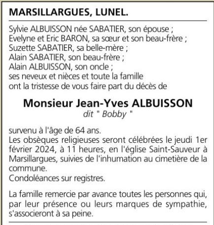 Jean-Yves ALBUISSON est né le 25 août 1959 à Montpellier (Hérault).