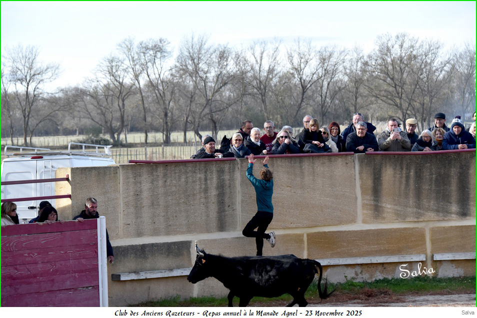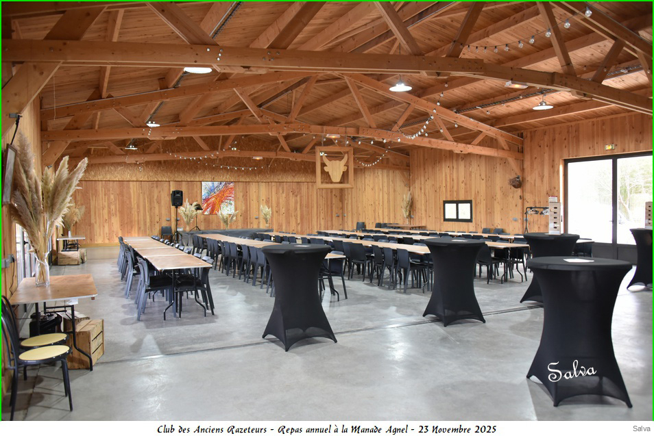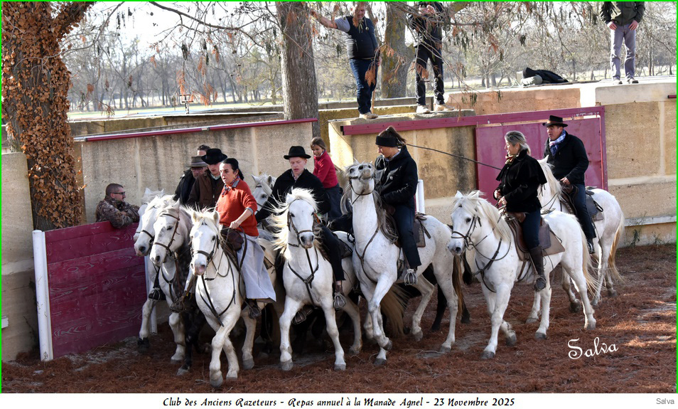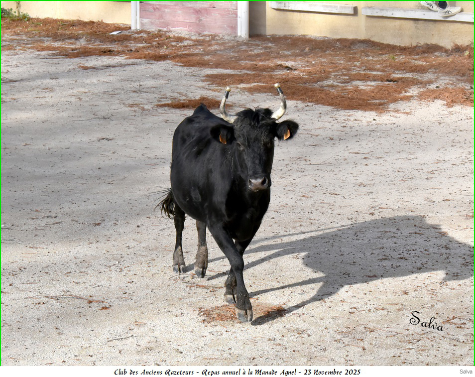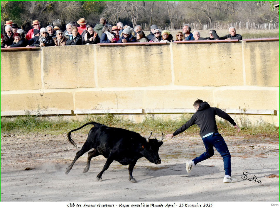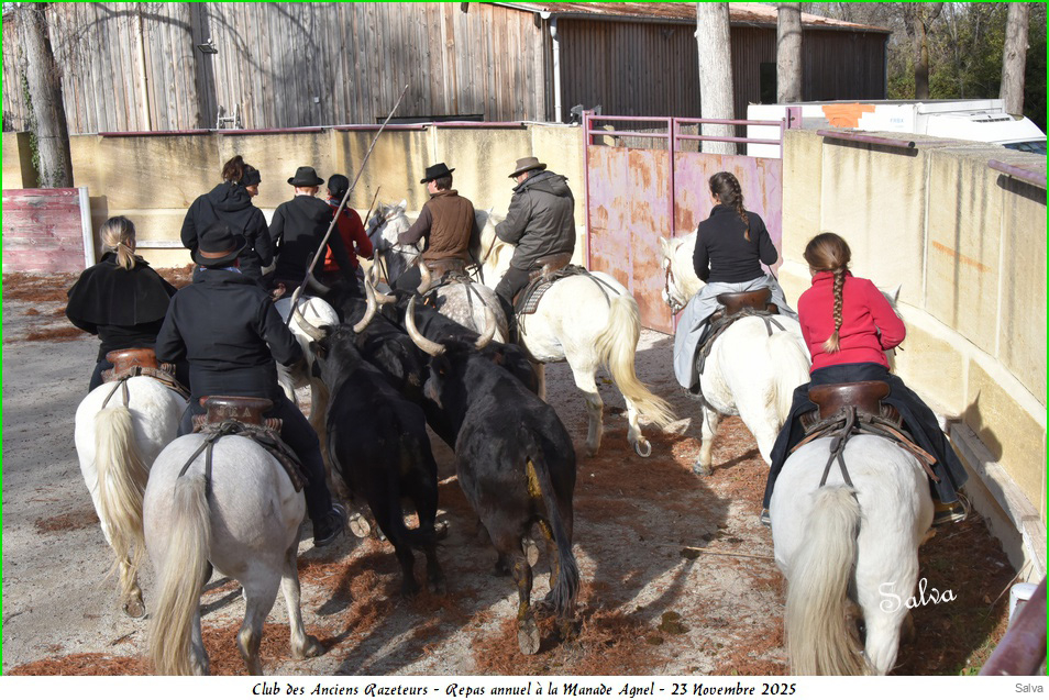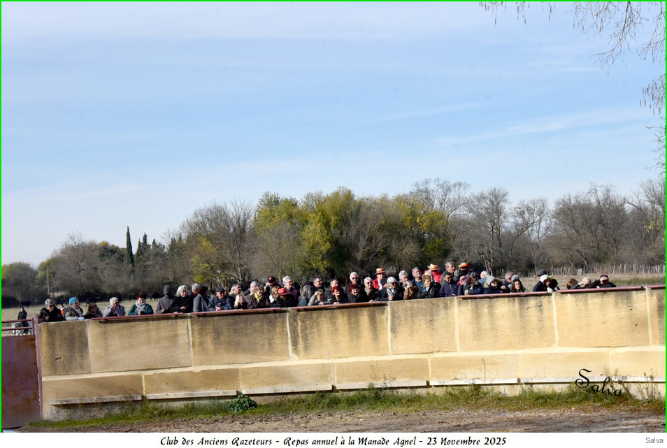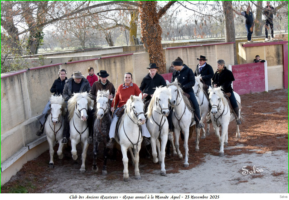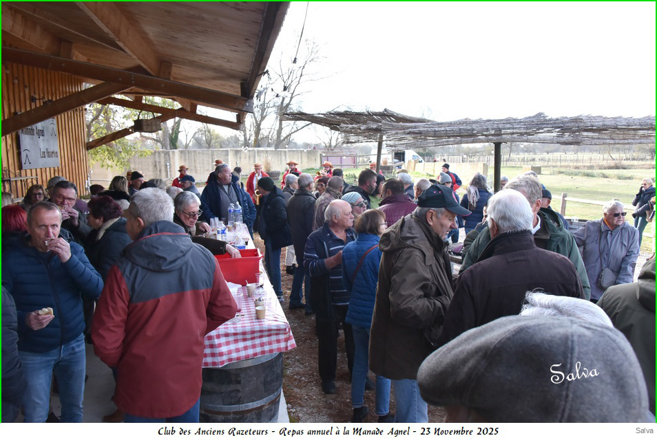 Comme annoncé, il a eu lieu le 23 novembre 2025 au Cailar chez la manade Agnel aux Hourtès. Cette journée est l’événement majeur du Club des Anciens Razeteurs. Préparée longtemps à l’avance, elle réunit tous ces anciens (défense d’employer le mot « vieux » !!!) acteurs de la course camarguaise ainsi que ses amis et sympathisants. Pour ceux qui ne sont pas dans ce cercle, ce qui frappe au premier abord c’est la sympathie, la solidarité qui se dégage de leurs rapports. Ils ont pu être de grands rivaux sur le sable, ils sont des frères dans la vie.