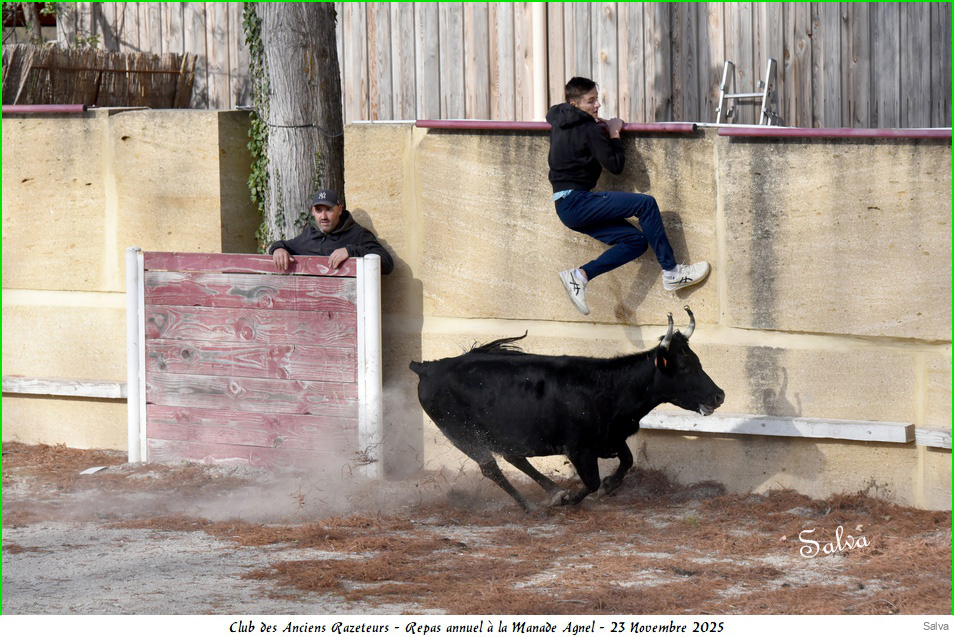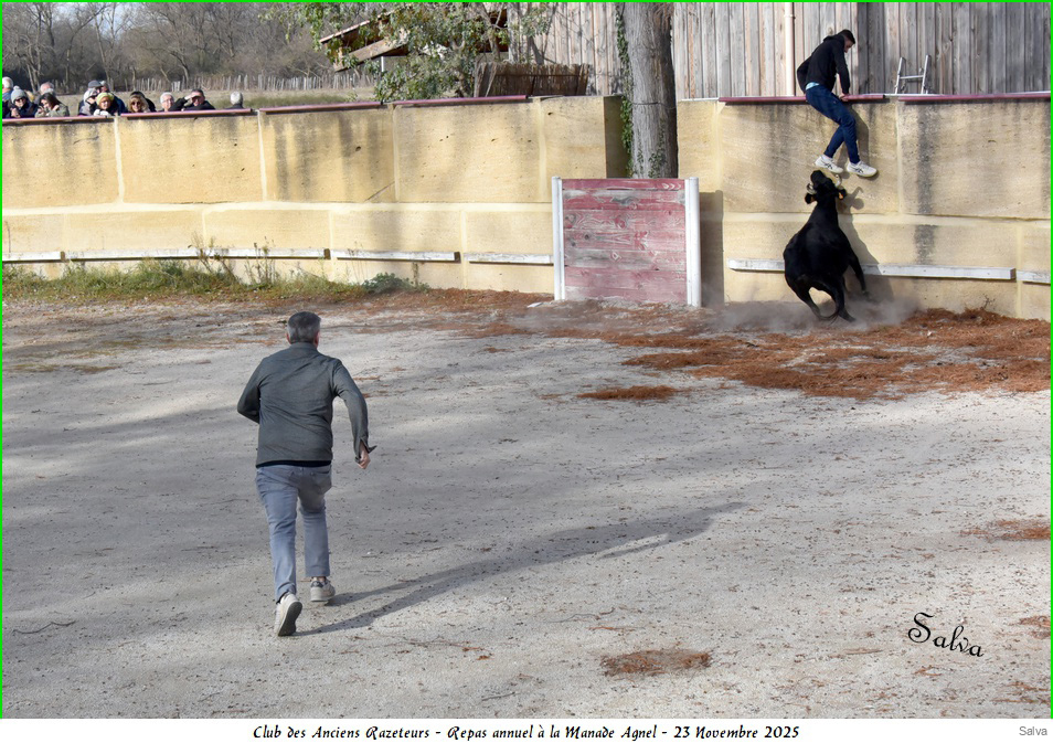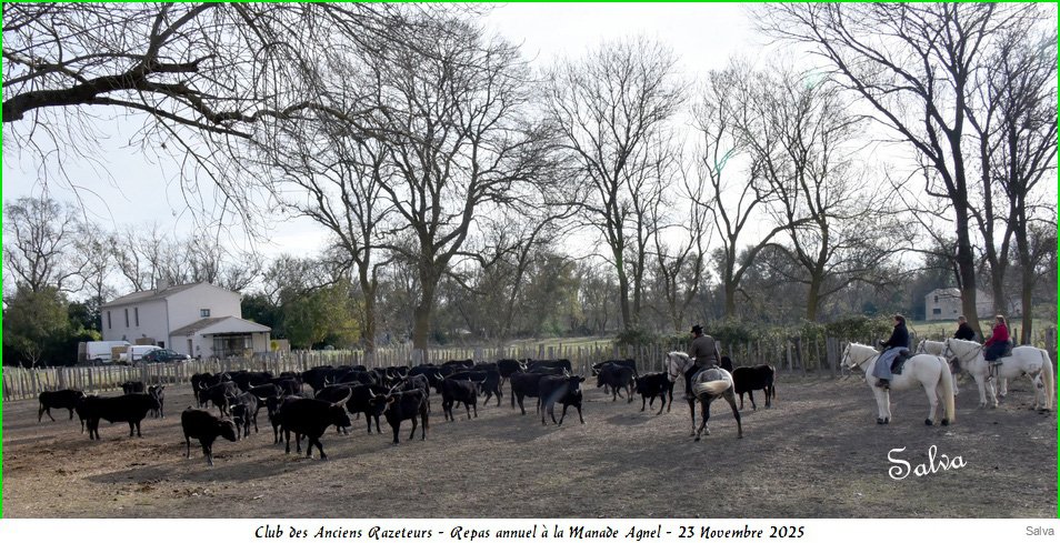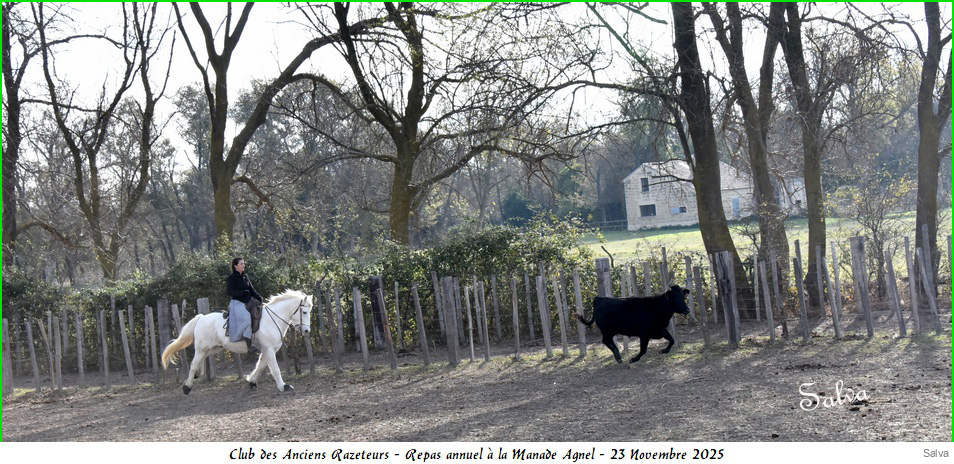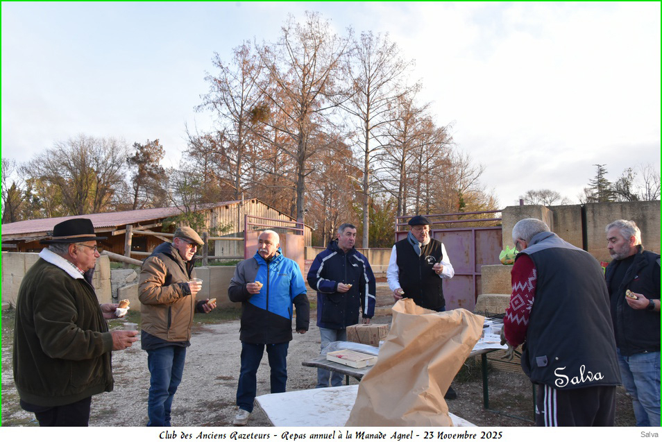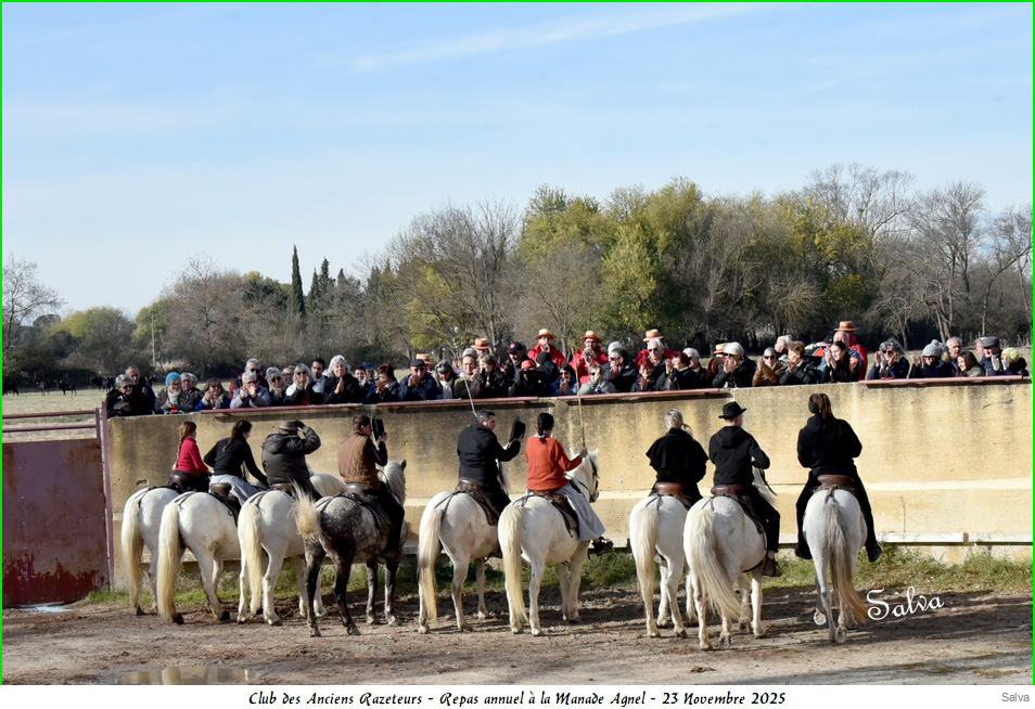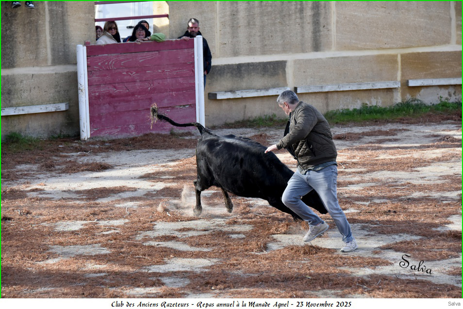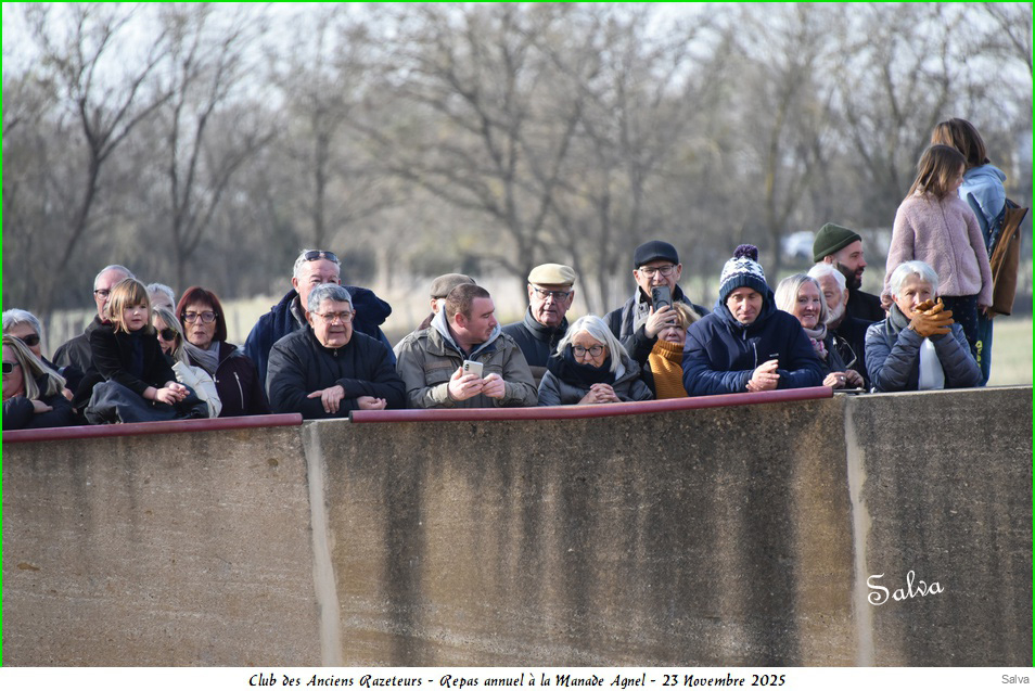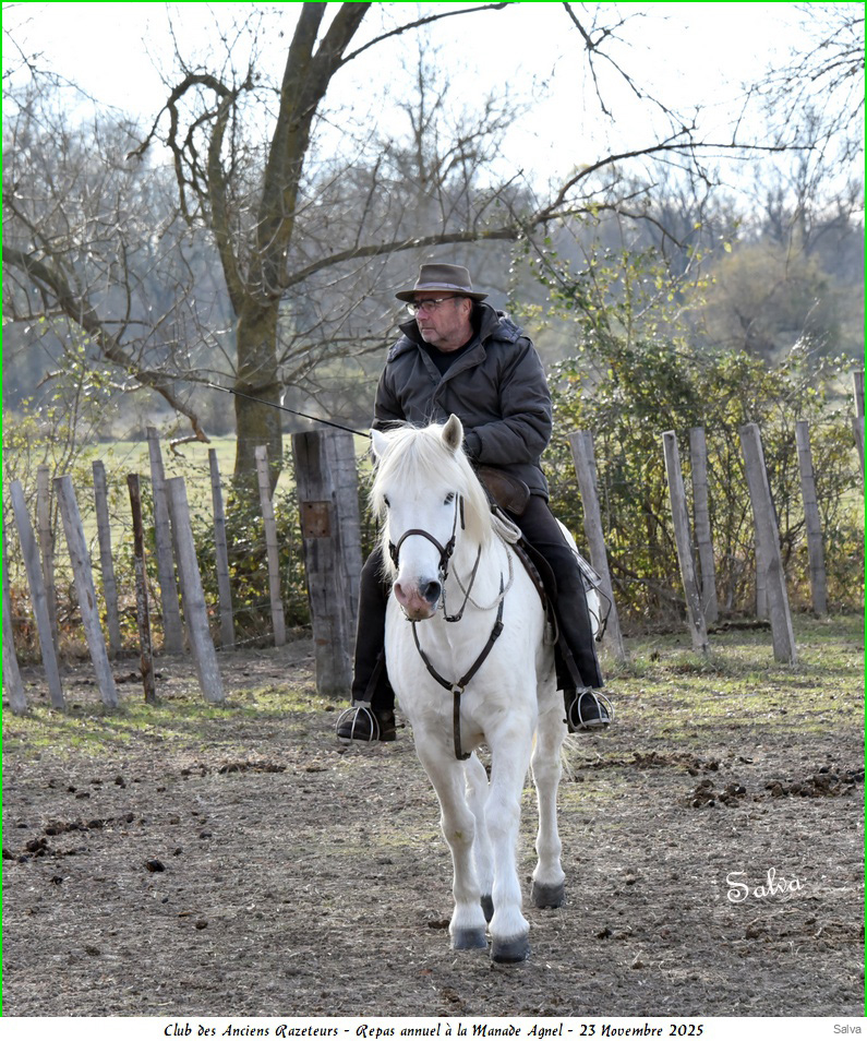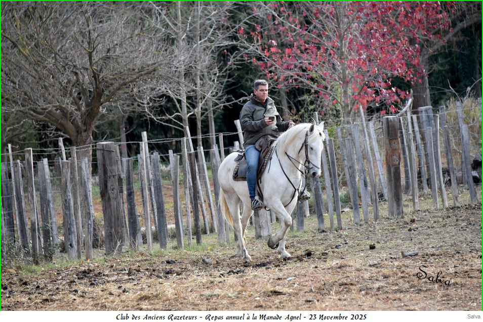 Comme annoncé, il a eu lieu le 23 novembre 2025 au Cailar chez la manade Agnel aux Hourtès. Cette journée est l’événement majeur du Club des Anciens Razeteurs. Préparée longtemps à l’avance, elle réunit tous ces anciens (défense d’employer le mot « vieux » !!!) acteurs de la course camarguaise ainsi que ses amis et sympathisants. Pour ceux qui ne sont pas dans ce cercle, ce qui frappe au premier abord c’est la sympathie, la solidarité qui se dégage de leurs rapports. Ils ont pu être de grands rivaux sur le sable, ils sont des frères dans la vie.